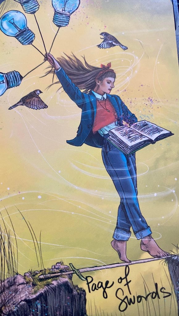 The Page of Swords has to do with curiosity, a thirst for knowledge, learning new things, intellectual pursuits, ideas and reasoning. She has a quest for knowledge that seems unquenchable! She is an incredibly quick witted communicator, has many ideas and messages to share with others, and her energy can come across as unsettled and even nervous sometimes.